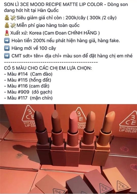 Dạo một vòng quanh các shop bán mỹ phẩm online trên Facebook và Instagram, bạn sẽ dễ dàng bắt gặp những lời rao vô cùng mát tai như "Son lì 3CE Mood Recipe chỉ 200 ngàn 1 cây, 300 ngàn 2 cây, xuất xứ Hàn Quốc, cam đoan chính hãng". Nếu không rành son Hàn và tham khảo giá chính hãng trước, hẳn rất nhiều cô nàng sẽ tin sái cổ đây là son 3CE xịn.