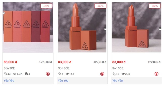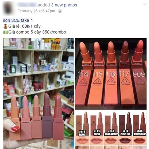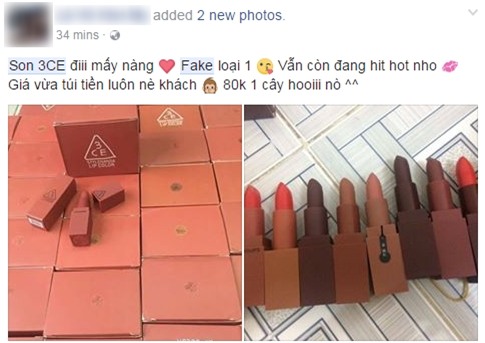 Bên cạnh tình trạng "treo đầu dê bán thịt chó", nhiều shop còn công khai rao bán son 3CE fake cả trên mạng xã hội lẫn trên các website mua sắm tổng hợp. Mức giá thấp nhất của 1 cây son 3CE fake nằm trong khoảng 30.000 - 80.000 đồng. Không chỉ tại các shop mỹ phẩm online, tại những khu chợ lớn như chợ Đồng Xuân cũng đang bày bán loại son 3CE fake siêu rẻ này.