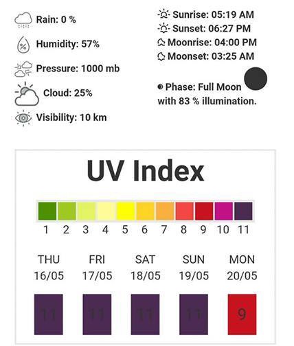 Theo trang worldweatheronline, chỉ số tia UV đo được tại Hà Nội ở thời điểm hiện tại đã đạt mức 11, thậm chí còn đang có chiều hướng tăng. Chỉ số này không chỉ trong 2 ngày qua mà còn duy trì trong 3 ngày tới.