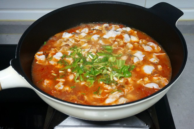 Đổ lượng nước nóng vừa ăn vào đun sôi, khi nước sôi thì cho thịt cá vào. Nêm thêm chút muối, nước tương cho vừa ăn. Đun cho đến khi thịt cá chín thì thêm hành lá và ớt vào rồi tắt bếp.