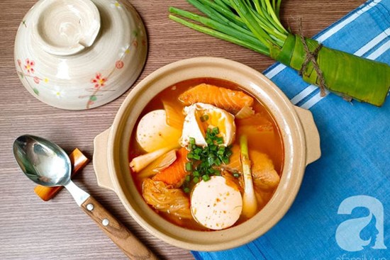 Lâu lâu "ăn sang" một bữa, nấu canh cá hồi kim chi mời cả nhà ăn tối bạn nhé!