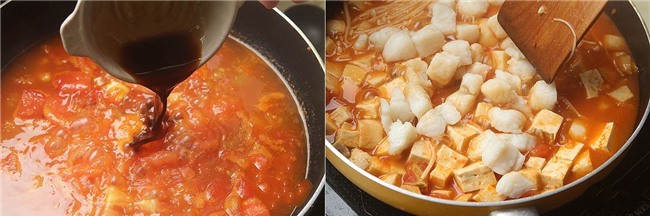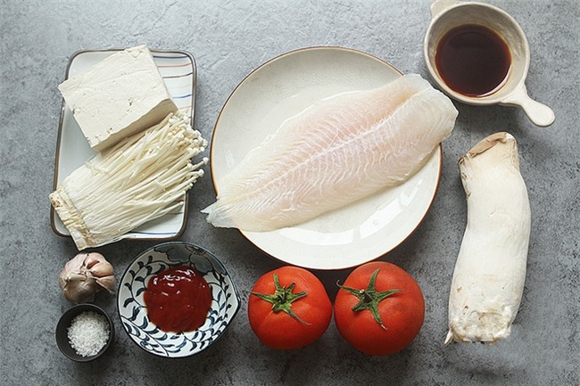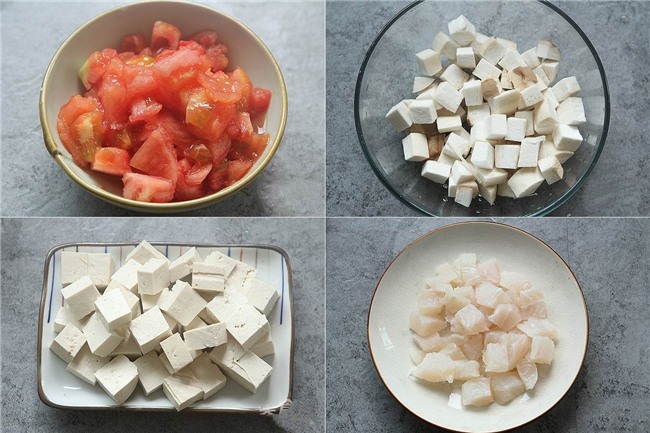 Cà chua luộc qua rồi bóc bỏ vỏ thái nhỏ. Nấm đùi gà, đậu phụ và cá thái miếng vuông.