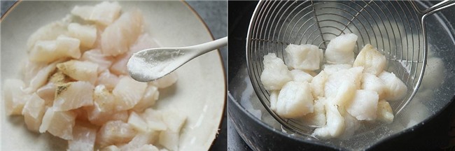 Cho một ít muối, hạt tiêu vào cá rồi trộn đều, ướp cá khoảng 15 phút. Đun sôi một nồi nước, cho cá đã ướp vào nồi, khi nồi nước sôi trở lại thì vớt cá ra ngay.