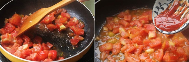 Cho một ít dầu ăn vào nồi, thêm tỏi băm nhỏ vào xào thơm, cho cà chua vào đảo cho mềm rồi thêm sốt cà chua.