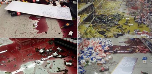 kệ hàng xiêu vẹo, đồ đạc rơi xuống sàn trong siêu thị, trung tâm thương