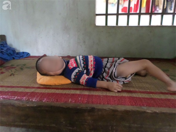 Bé trai 6 tuổi Trần Văn Phúc (SN 2010, con trai lớn của chị Thu), dáng người gầy gò, yếu ớt, khuôn mặt ngơ ngác, phía trán có một khối u nhô cao, chân tay teo tóp, thẳng đuột nằm bẹp trên chiếc giường cũ nát.