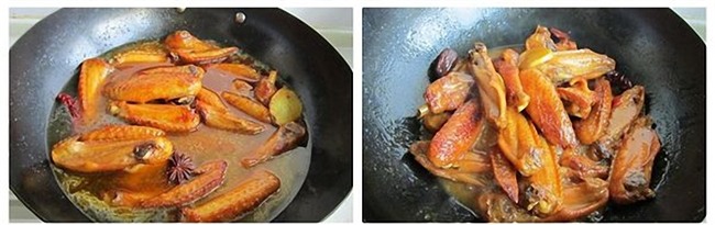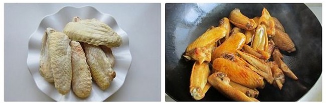 Cánh gà mua về rửa sạch sau đó bắc lên bếp luộc sơ qua rồi vớt ra để ráo. Bắc chảo lên bếp cùng chút dầu ăn, sau đó cho đường phèn vào cho dầu chuyển màu nâu rồi cho cánh gà vào đảo đều.