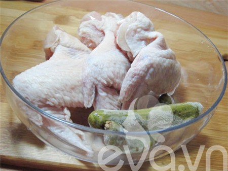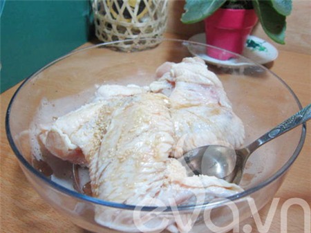 Bước 1: Cánh gà rửa sạch, dùng dao khứa nhẹ mấy đường trên cánh gà. Ướp cánh gà với 1 ít hạt nêm, 1 thìa ăn cơm mắm trong khoảng 1 tiếng.