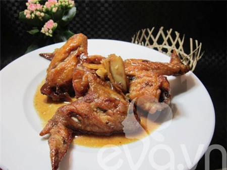 Bước 6: Vặn nhỏ lửa, cho cánh gà vào om trong khoảng 5 phút để cánh gà thấm xốt (thi thoảng trở đều các mặt cho xốt thấm đều).