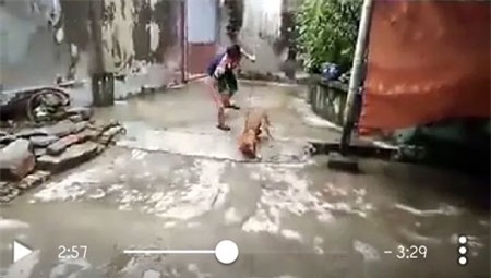 Một người đàn ông khác dùng 1 tay túm lấy sợi dây xích, tay kia giờ chày lên cao rồi đánh mạnh vào đầu, lưng của chú chó tội nghiệp. Mặt dù đã cố nép mình vào gốc cây để tránh đòn, nhưng với sự hung hãn của những người có mặt, chú chó dần khuỵu xuống.