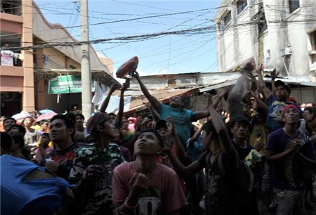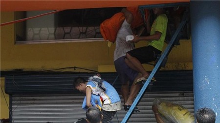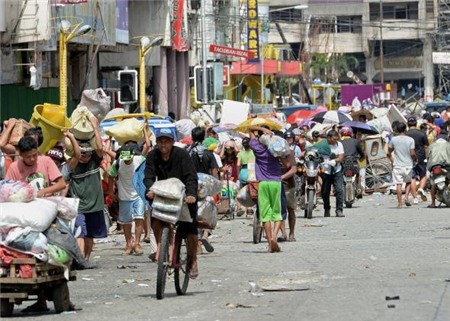 | Đám đông chờ chiến lợi phẩm mà một nhóm người hôi của ở một siêu thị phía trên ném xuống tại thành phố Tacloban hôm 9/11. Ảnh: AFP. |