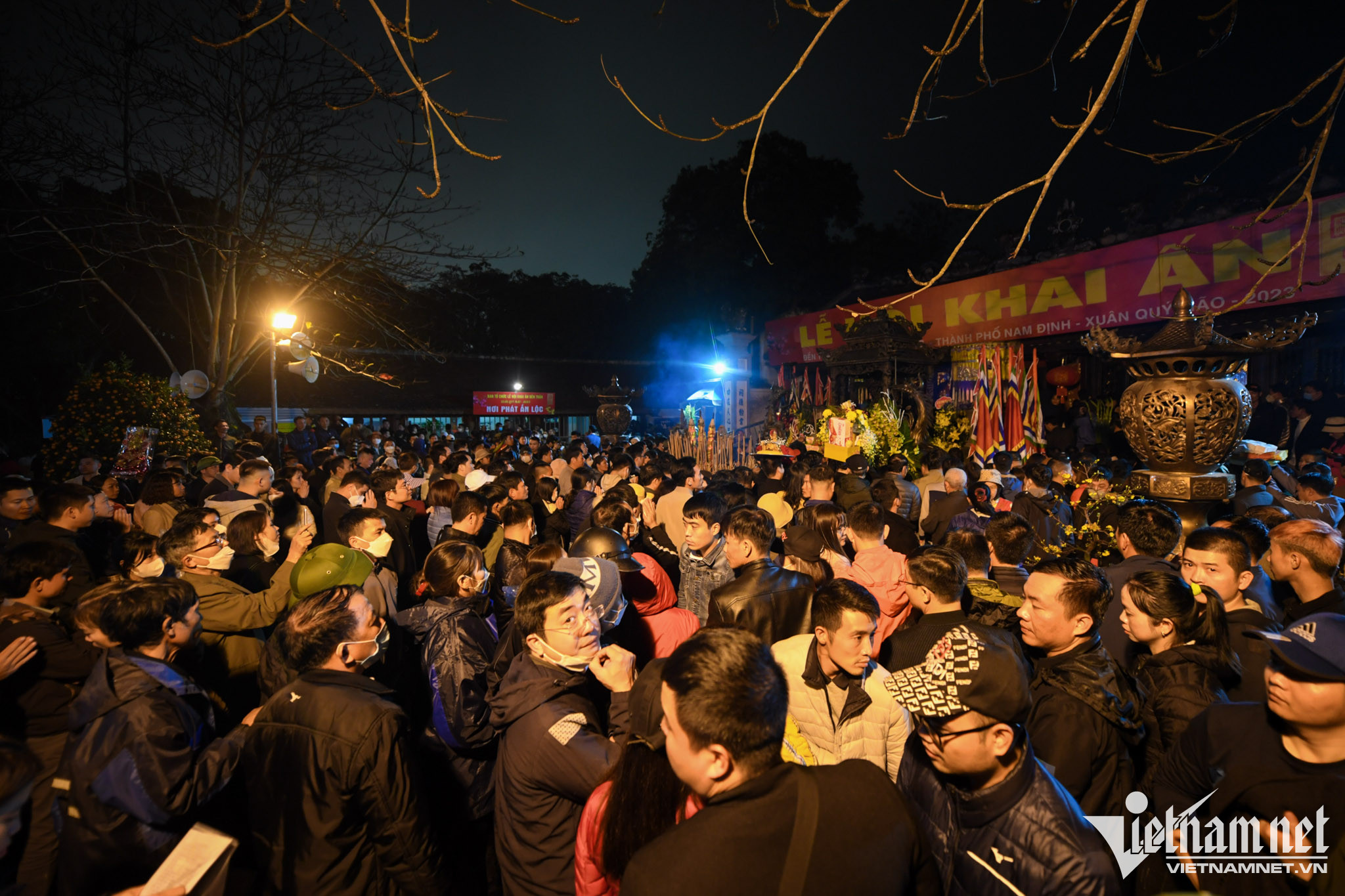 Khách mời và người dân đổ dồn về phía cửa đền Thiên Trường nhưng năm nay cửa đền này không mở nhằm ngăn chặn tình trạng cướp lộc trên ban thờ.