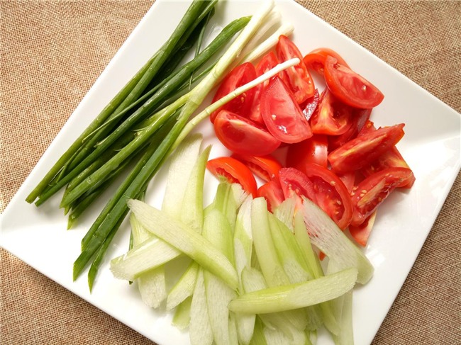 Cà chua rửa sạch bổ múi cau, dọc mùng tước vỏ rửa với nước muối loãng rồi thái vát. Hành, răm rửa sạch thái nhỏ.