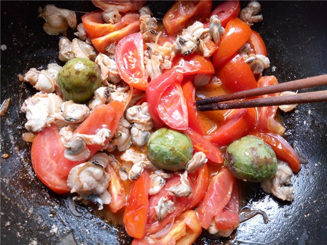 Phi thơm hành khô băm nhỏ với dầu ăn, cho cà chua vào xào cùng, nêm 1 thìa bột canh, đậy nắp vung để cà mau mềm. Sau đó cho thịt hến, sấu đã cạo vỏ vào xào cùng.