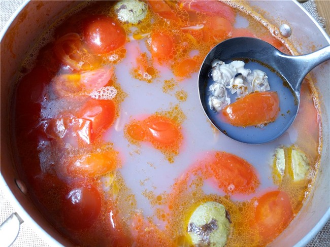 Cho phần cà chua vừa xào vào nồi,đổ 1 bát tô nước rồi đun sôi. Khi canh sôi hạ bớt lửa, nêm nếm gia vị cho vừa miệng.