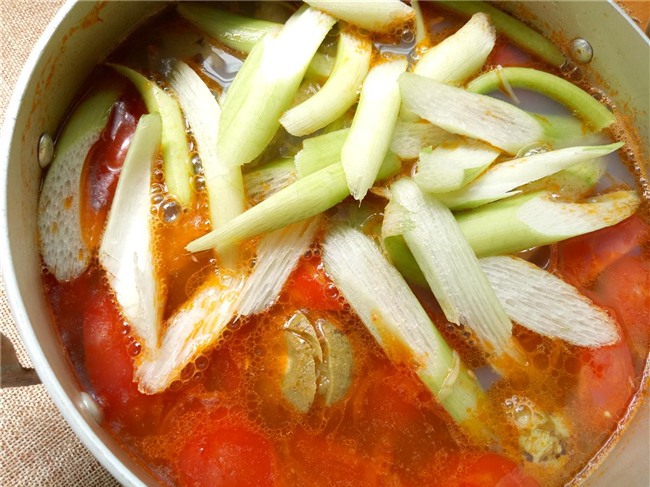 Thả dọc mùng vào đun thêm khoảng 1-2 phút hay khi thấy dọc mùng chín thì cho hành, răm vào. Tắt bếp thêm 1 thìa canh mì chính.