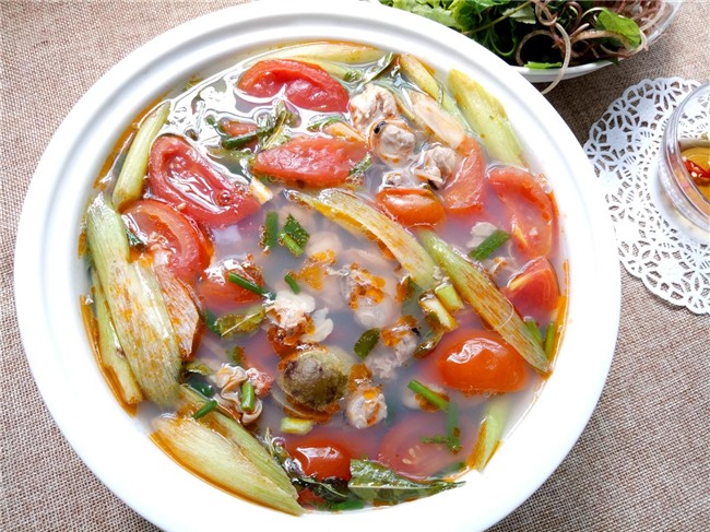 Trút canh riêu hến dọc mùng ra bát. Canh riêu hến nấu dọc mùng có vị chua dịu nhẹ thơm ngon rất đưa cơm ngày trời nắng.