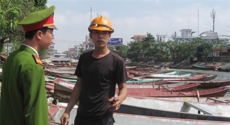 Cảnh sát nhắc nhở lái đò không vòi tiền khách đi lễ chùa Hương. Ảnh: Việt Đức. |