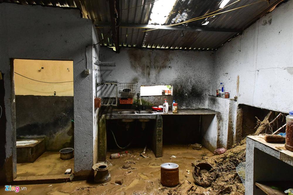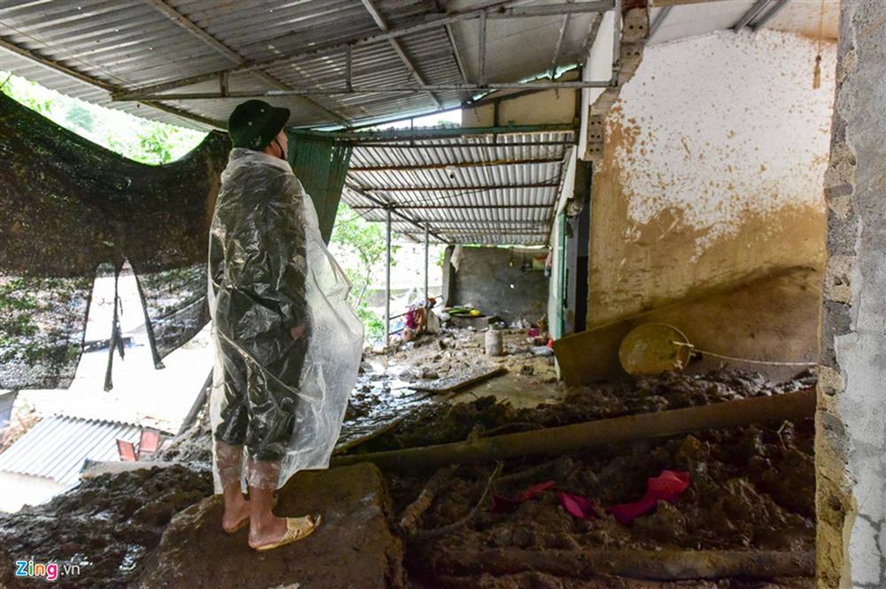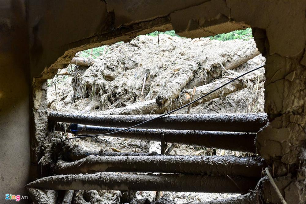Hiện khu trại nuôi cá tầm, cá hồi của anh Long chỉ còn là một đống đổ nát. Tường nhà cũng bị thủng những mảng lớn do sức ép của đất đá.