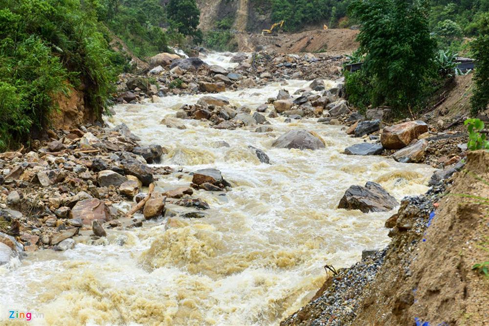 Sáng 26/6, con suối chảy qua thôn Chu Va 12 vẫn đang cuồn cuộn chảy. Trời vẫn mưa và nước chưa rút.