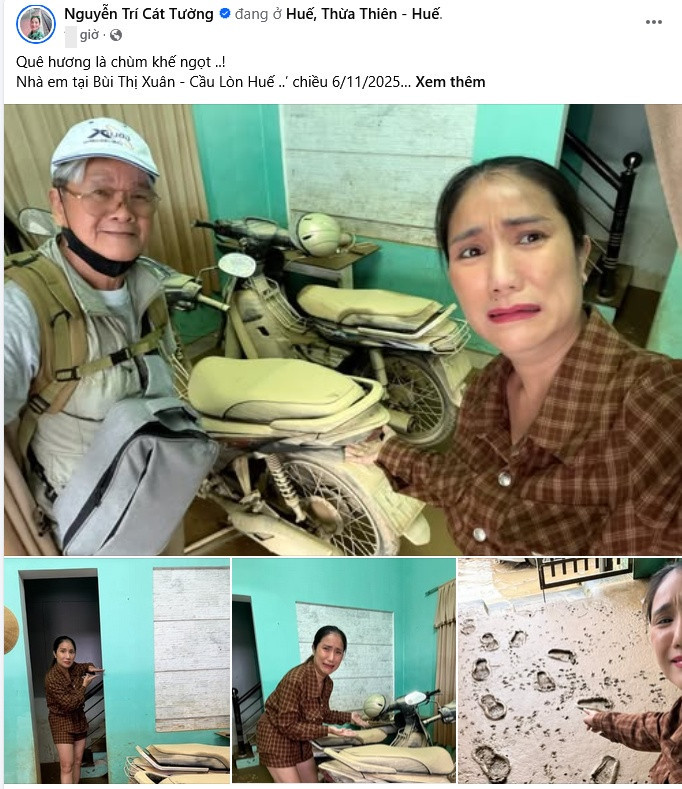 MC Cát Tường than thở không biết bắt đầu dọn dẹp từ đầu. Cô viết: "Quê hương là chùm khế ngọt. Nhà em tại Bùi Thị Xuân - Cầu Lòn Huế chiều 6/11/2025. Bão đang vào khu vực Nam Trung Bộ, gia đình em phải ra khách sạn ngủ và chỉ biết cầu mong cho tất cả bà con được bình an, xem tin tức mà sợ quá hu hu."