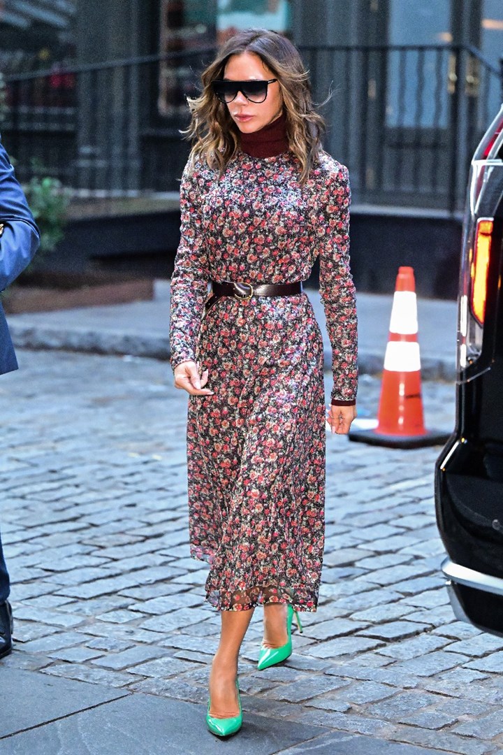còn đa dạng hóa style với váy liền. Váy liền mang đến sự nữ tính, bay bổng và giúp vẻ ngoài thêm nổi bật. Victoria Beckham hiếm khi diện váy suông rộng. Thay vào đó, cô ưu tiên các thiết kế váy có chi tiết nhấn eo. Lựa chọn này giúp thu gọn vóc dáng, đồng thời tăng chiều cao cho người diện. Những mẫu váy nhấn eo được Victoria Beckham yêu thích bao gồm: váy hoa, váy xẻ tà hay váy sơ mi trẻ trung.