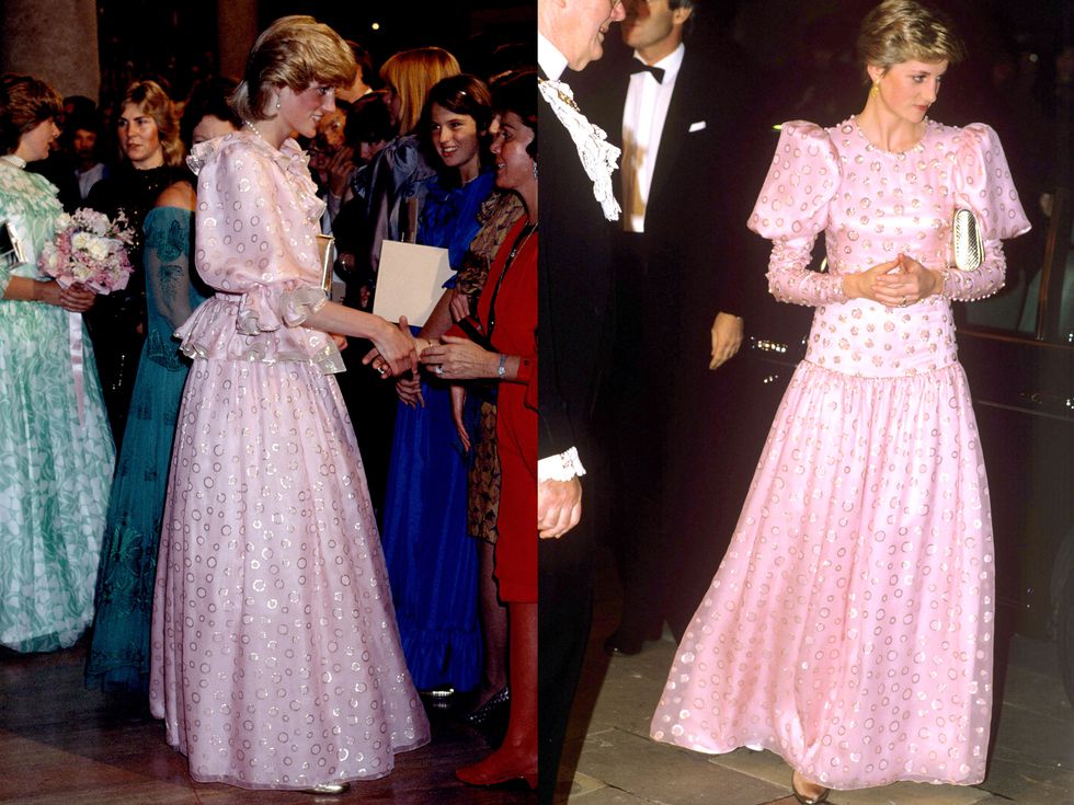 Tham dự sự kiện tại Melbourne năm 1983, Công nương Diana khoác lên mình chiếc váy dạ hội màu hồng nhạt xòe nhẹ với phần tay bồng nữ tính, điệu đà. Vẫn là thiết kế ấy nhưng 3 năm sau, nó được biến tấu thêm phần tay dài, tối giản lại độ xòe, đổi thành mẫu đầm đuôi cá thanh lịch