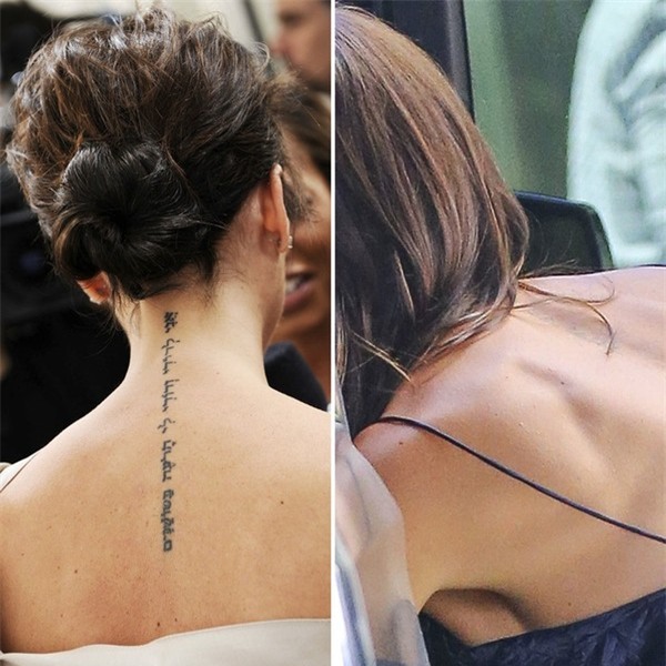 Liên tiếp trong vòng ít tháng qua, Victoria Beckham đã đi xóa 2 hình xăm liên quan tới Beckham. Đầu tiên là dòng chữ DB, tên viết tắt của cựu ngôi sao Man United ở cổ tay trái. Mới đây nhất, bà mẹ 4 con cũng đã quyết định đi xóa hình xăm chạy dọc từ gáy xuống vai. Đây là dòng chữ Do Thái có ý nghĩa là "I am my beloved’s and my beloved is mine" (Tôi thuộc về người tôi yêu và người yêu tôi thuộc về tôi). Dòng chữ được cặp vợ chồng hạnh phúc lựa chọn để ghi dấu lên cơ thể nhau có xuất xứ từ một bài thơ tiếng Do Thái.