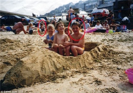 đang ngồi trên bãi cát để đắp lâu đài cùng gia đình mà không hề biết đến