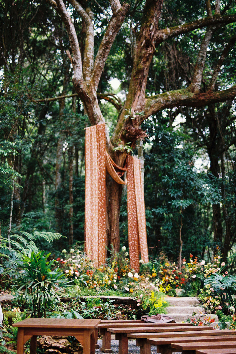 Lễ đường của Vy được đặt tại khu rừng thông, xung quanh trang trí bởi hoa tươi đủ màu sắc. Không gian cưới được bao phủ bởi tông màu trầm, ấm, tuy nhiên không kém phần lãng mạn và thơ mộng.