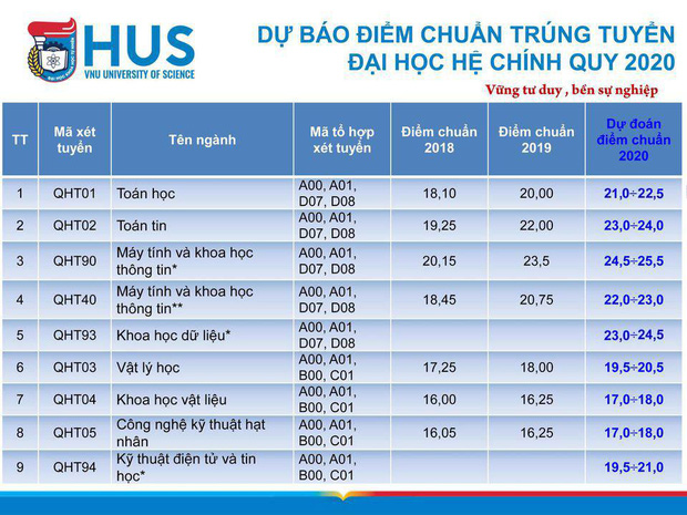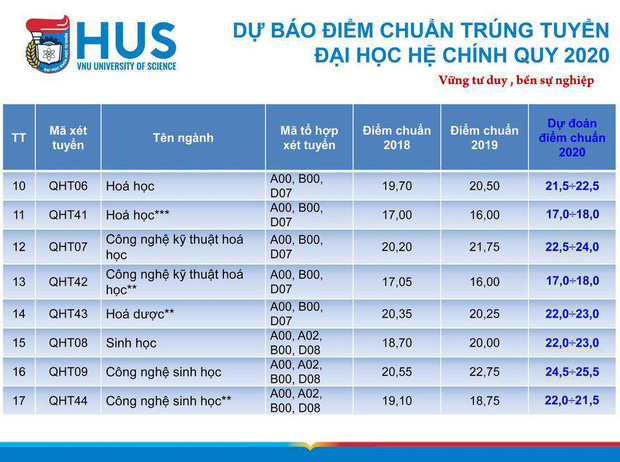 Nhóm admin tư vấn tuyển sinh với nhiều năm kinh nghiệm của Đại học Khoa học Tự nhiên đã đưa ra dự đoán về mức điểm chuẩn năm nay để giúp các thí sinh có thêm thông tin tham khảo nhằm đăng ký, thay đổi nguyện vọng. Điểm chuẩn trúng tuyển chính thức của trường ĐHKHTN sẽ chính thức được công bố trước 17h ngày 5/10/2020.