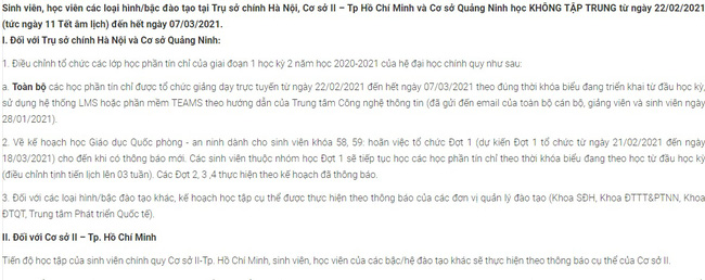 Theo đó, nhằm thực hiện kế hoạch năm học 2020-2021 đúng tiến độ, đồng thời đảm bảo an toàn chung trong tình hình dịch bệnh diễn biến phức tạp, trường cho phép người học (gồm sinh viên, học viên và nghiên cứu sinh) học tập trực tuyến trong 2 tuần sau thời gian nghỉ tết (từ 22/2 đến hết ngày 7/3).
