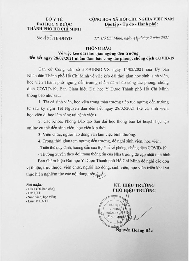 Trường ĐH Y dược TP.HCM cũng vừa ra thông báo kéo dài thời gian ngừng đến trường tới hết tháng 2.