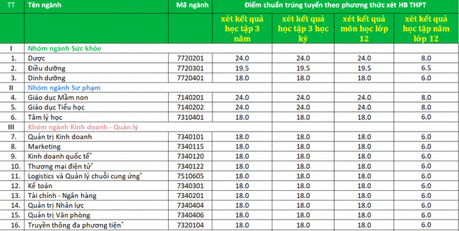 Điểm chuẩn phương thức xét kết quả học tập THPT (học bạ):