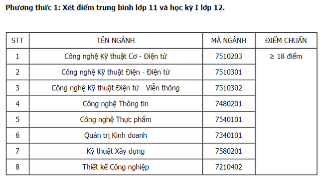 Điểm trúng tuyển trình độ đại học các ngành không thuộc khối ngành đào tạo giáo viên: Tổng điểm học kỳ I hoặc học kỳ II năm lớp 12 của 3 môn học trong tổ hợp môn xét tuyển từ 16,5 trở lên (không phân biệt tổ hợp xét tuyển).