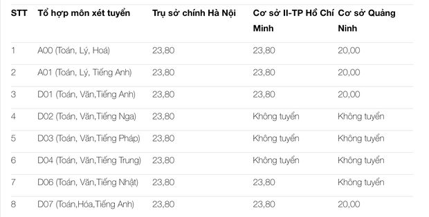 Đối với các ngành có tổ hợp môn tiếng Anh tính hệ số 2, các môn khác tính hệ số 1, quy về thang điểm 30 theo công thức: (điểm môn 1 + điểm môn 2 + điểm tiếng Anh *2) *3/4 + điểm ưu tiên.