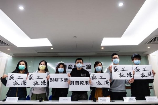 Đại diện của nhiều công đoàn khác nhau giữ các khẩu hiệu trong cuộc họp báo về bản cập nhật mới nhất về các hành động đình công ở Hồng Kông vào ngày 2 tháng 2 năm 2020. ẢNH: AFP