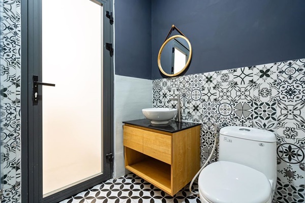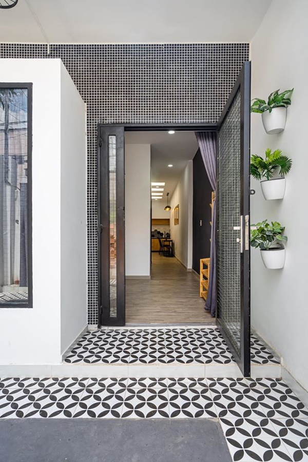 Bởi sở hữu gu "thích màu mè" nên chủ nhân chọn nền gạch ở sân họa tiết. Cửa được làm từ kính, khung sắt. Bên trong có hàn lưới chắc chắn mà vẫn thoáng.