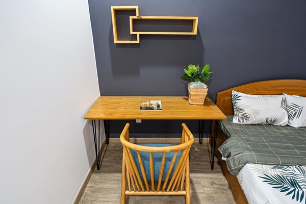 Ở một phòng ngủ khác giường gỗ từ nhà cũ vẫn được sử dụng. Bàn làm việc phòng ngủ thì được anh chồng tận dụng cưa ra làm từ tủ rượu của nhà.