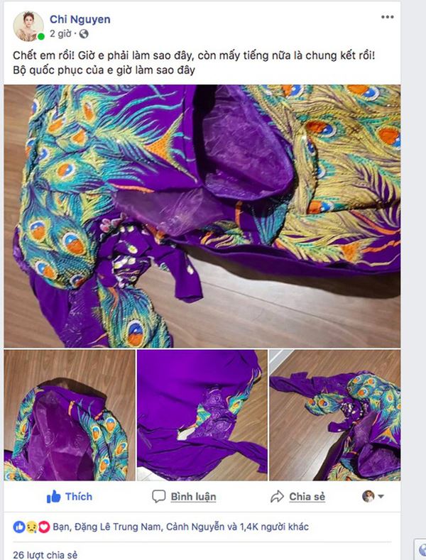 Đại diện Việt Nam đi thi Miss Asia World 2018, người đẹp Chi Nguyễn còn lâm vào tình cảnh thê thảm hơn. Sau buổi tổng duyệt cho đêm chung kết, Chi Nguyễn cùng dàn thí sinh quay trở về phòng để chuẩn bị trang phục thì bất ngờ phát hiện bộ Quốc phục Khổng Tước lộng lẫy nặng tới 20 kg đã hoá thành đống vải nát!