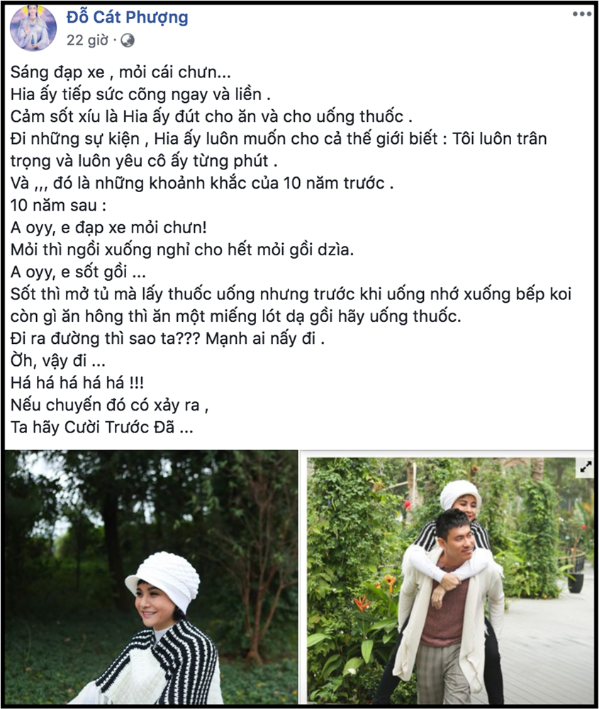 "Sáng đạp xe, mỏi cái chân, hia ấy tiếp sức cõng ngay và liền. Cảm sốt xíu là hia ấy đút cho ăn và cho uống thuốc. Đi những sự kiện, hia ấy luôn muốn cho cả thế giới biết: Tôi luôn trân trọng và luôn yêu cô ấy từng phút. Và đó là những khoảnh khắc của 10 năm trước, 10 năm sau: Anh ơi, em đạp xe mỏi chân - mỏi thì ngồi xuống nghỉ cho hết mỏi rồi về. Anh ơi, em sốt rồi - sốt thì mở tủ mà lấy thuốc uống nhưng trước khi uống nhớ xuống bếp coi còn gì ăn không thì ăn một miếng lót dạ rồi hãy uống thuốc. Đi ra đường thì sao ta? Mạnh ai nấy đi... Ờ, vậy đi, nếu chuyến đó có xảy ra, ta hãy cười trước đã", Cát Phượng viết.