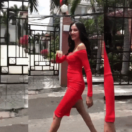 "Trong ngõ hẻm thôi mà cô gái cứ tưởng tượng sân khấu của Miss Universe ( Hoa hậu Hoàn vũ) nè", Hoàng Thùy chia sẻ về clip.