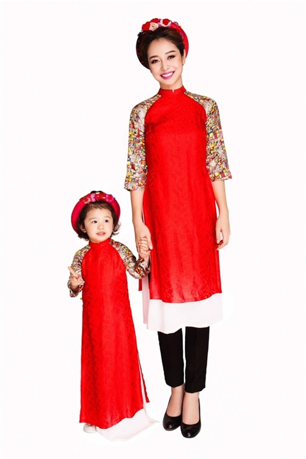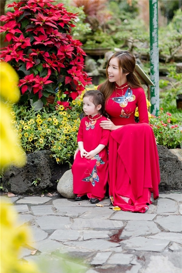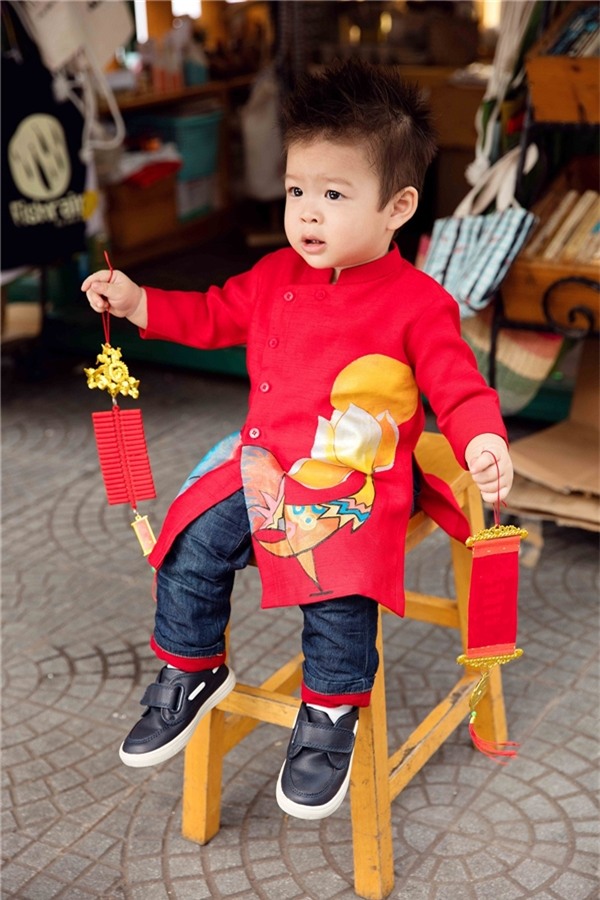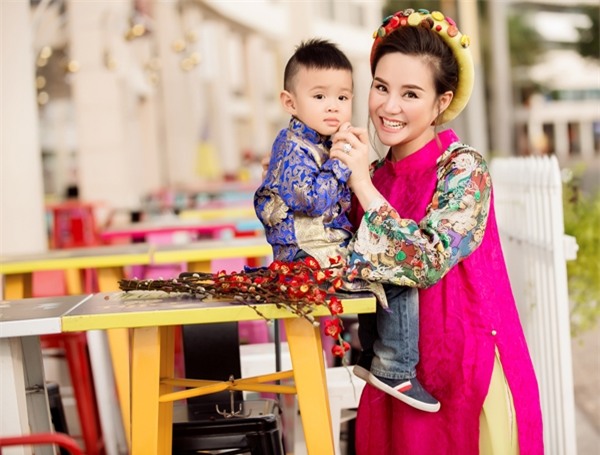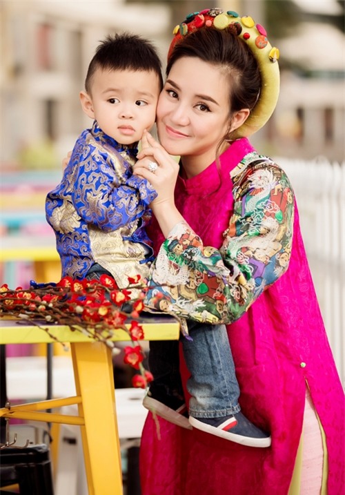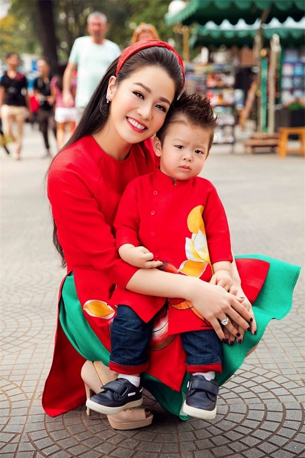 Dù bận rộn với lịch diễn cuối năm nhưng Nhật Kim Anh vẫn dành thời gian để xuống phố du xuân cùng con trai. Cậu bé nổi bật trên đường phố với bộ áo dài màu đỏ, họa tiết sắc vàng tươi tắn do đích thân mẹ lựa chọn.