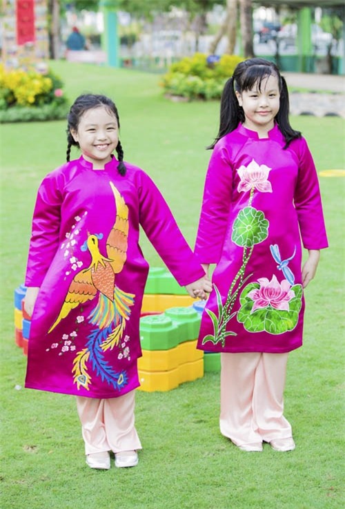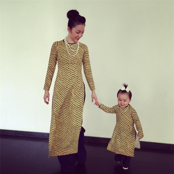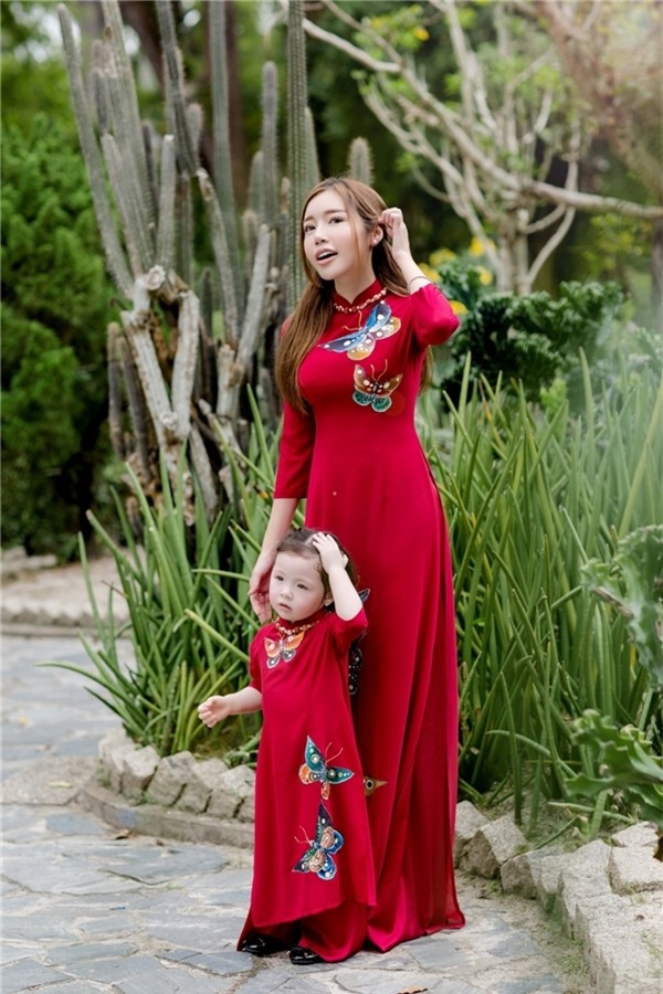 Những tà áo dài xinh xắn, họa tiết vui mắt của con gái Xuân Lan khiến người xem vô cùng thích thú. Cô bé tự do thoải mái vui đùa với phom dáng trang phục rộng. Sắc đỏ tươi hay tông màu hồng thẫm đều là lựa chọn tuyệt vời cho các bé trong dịp Tết này.