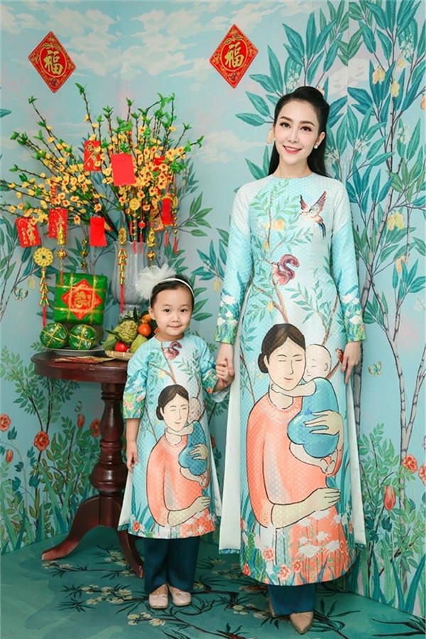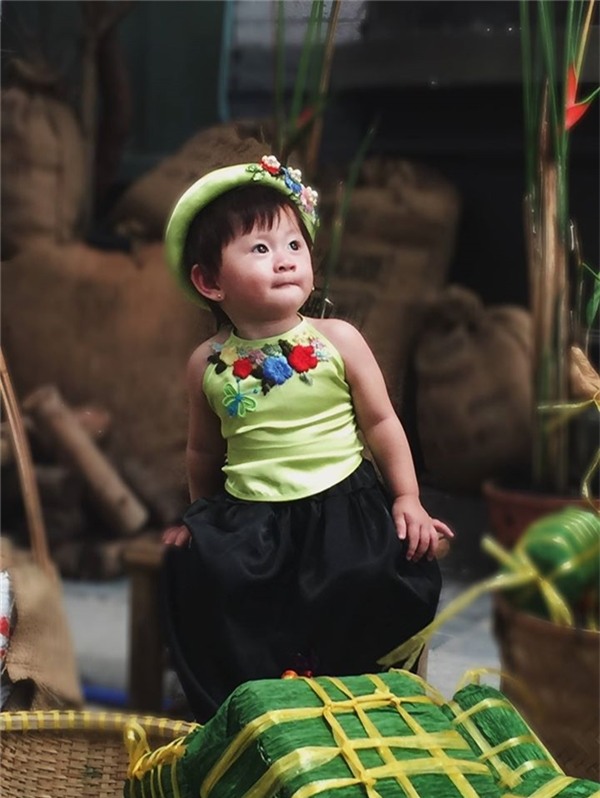 Không khí của những ngày Tết xưa được mẹ con Linh Nga tái hiện với khung cảnh bánh chưng, mứt Tết, dưa hành, hoa mai vàng… Cô bé được mẹ cho diện áo dài đồng điệu với sắc xanh ngọc ngọt ngào, họa tiết tranh dân gian đặc trưng của người Việt.