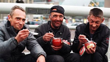 Những người vô gia cư vui vẻ ăn trứng cá cậu phát cho (Ảnh: Daily Mail) |