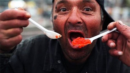 Chưa dừng lại ở đó, cậu bé mua 2 hộp trứng cá muối loại sang và phát cho 3 người vô gia cư ăn, đồng thời ghi lại cảnh trên.