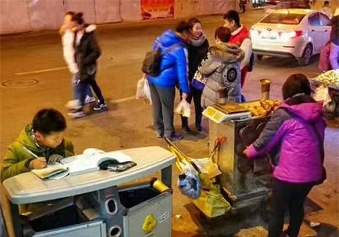 Mới đây, dân mạng Trung Quốc không ngừng chia sẻ những hình ảnh cảm động về cậu bé Nian Nian (9 tuổi) học bài trên nắp thùng rác cạnh xe khoai tây nướng của mẹ.