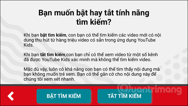 Bước 8: Ứng dụng sẽ hỏi người dùng có muốn bật tính năng tìm kiếm hay không. Nếu bật tính năng tìm kiếm thì trẻ vẫn sẽ tìm được những video khác có trong ứng dụng.