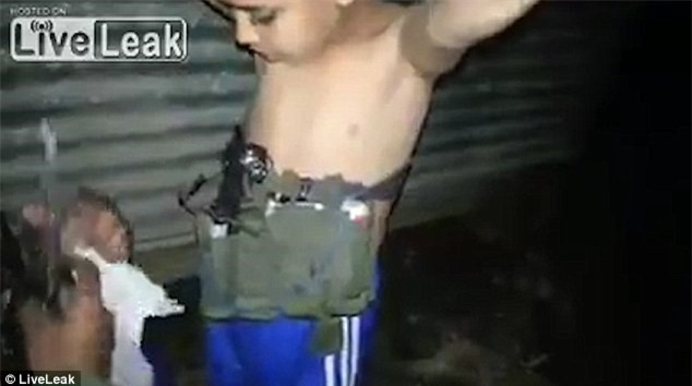 Các thiết bị được cho là có thể gây nổ được gắn quanh hông cậu bé. Ảnh: Chụp màn hình video của LiveLeak. |